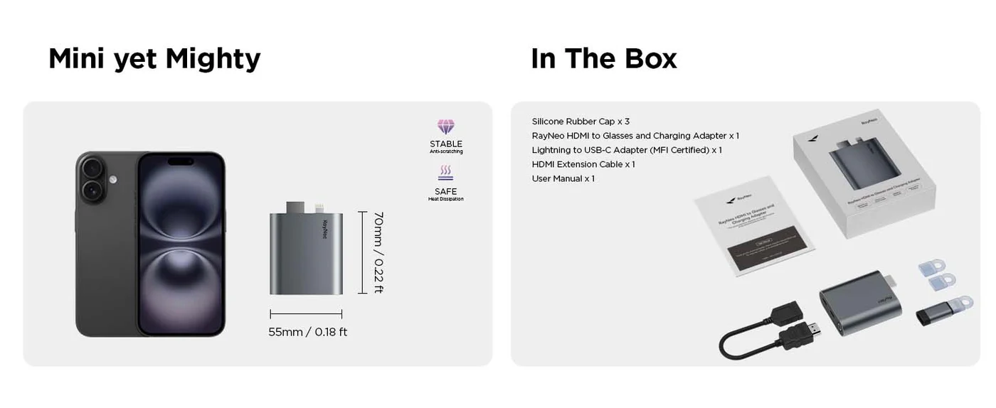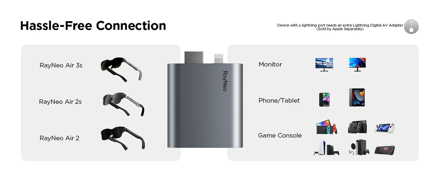 อุปกรณ์เสริมที่จำเป็นสำหรับผู้ใช้ iPhone รุ่น Lightning และอุปกรณ์ HDMI ทุกรูปแบบ เพื่อเชื่อมต่อเข้ากับแว่น AR RayNeo Air Series ให้ได้ภาพใหญ่ คมชัด และชาร์จไปใช้งานไปได้พร้อมกัน