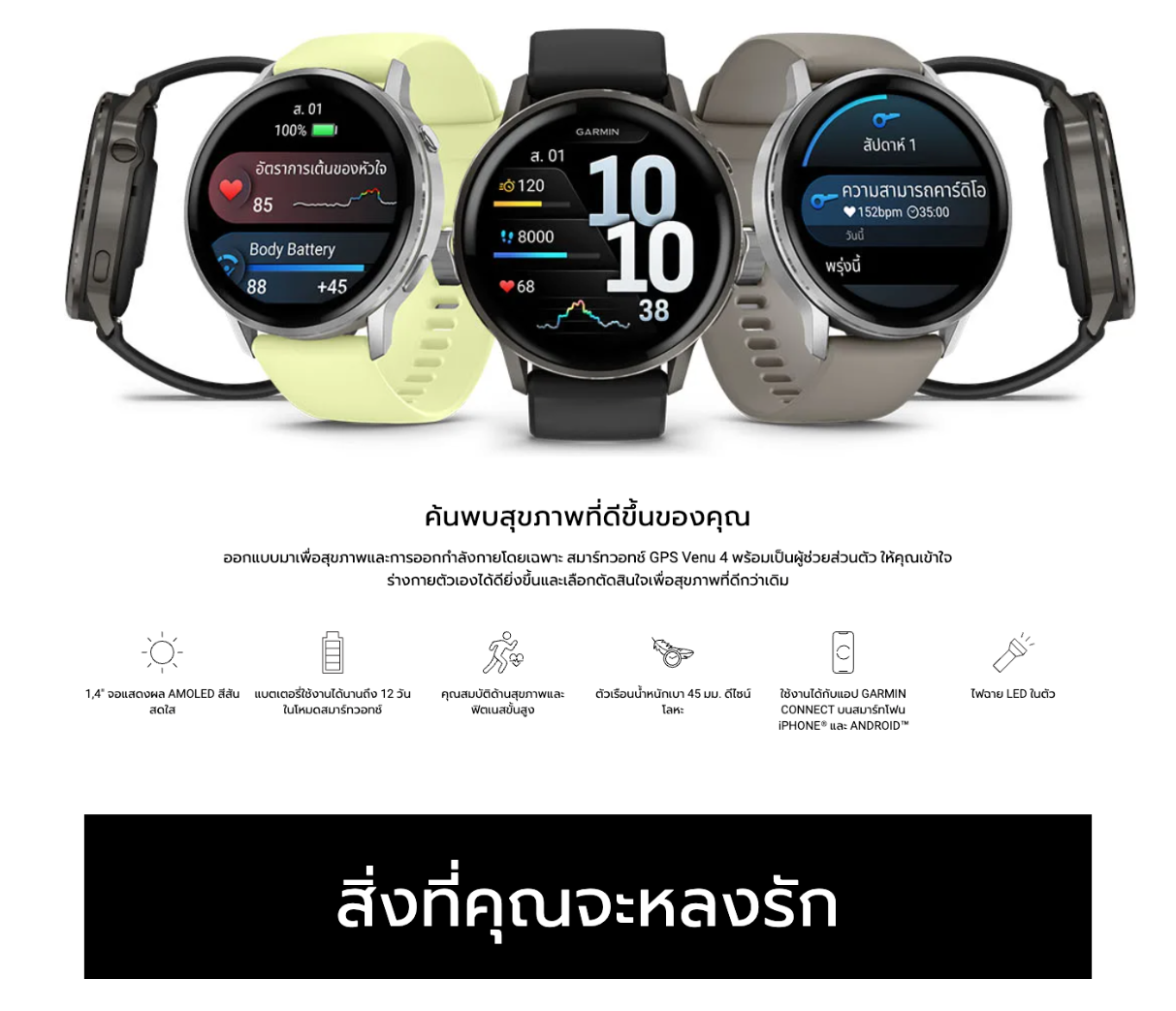 Garmin Venu 4 คืออีกรุ่นที่ ยกระดับทั้งในด้านสุขภาพและกีฬา จากสิ่งที่ Venu 3 เคยทำได้ มาพร้อมฟีเจอร์ใหม่ ๆ เยอะ ทั้งไฟฉายในตัว, ระบบติดตามสถานะสุขภาพที่ละเอียดขึ้น, GPS แม่นยำขึ้น, และแบตเตอรี่ที่ใช้งานได้นานขึ้น